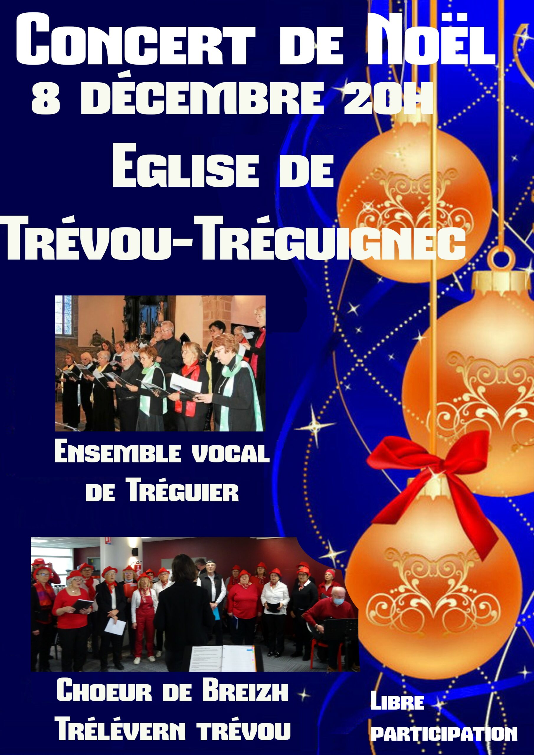 UN CONCERT DE NOEL OFFERT PAR DEUX CHORALES A L’EGLISE DE TREVOU TREGUIGNEC, LE VENDREDI 8 DECEMBRE, à 20 H   En première partie de ce concert de Noël, le chant sacré sera à l’honneur. Il sera interprété par l’Ensemble Vocal de Tréguier, dirigé par Françoise LE BOLLOC’H. Cet ensemble a été créé en 1978, sous l’égide de l'association « Les Amis de la Musique ».   Il laissera la place en 2ème partie à un répertoire complètement différent de chansons contemporaines interprétées par Choeur de Breizh Tréléven / Trévou, créé en 2021  et dirigé depuis peu par Pascale AGGETTAZ.   Deux chorales, deux répertoires très variés et pourtant tous motivés par la même envie de chanter et de se rencontrer. Et surtout d’offrir au public un mélange de styles musicaux, reflet de la mixité et de la différence.   Libre participation. Eglise chauffée